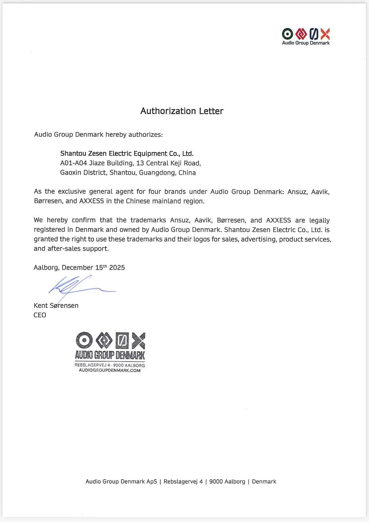 2025年12月22日,中国·汕头 —— 泽森音响与享誉全球的丹麦尖端声学科技品牌AXXESS Acoustics达成战略合作,即日起正式成为AXXESS Acoustics品牌在中国的总代理。