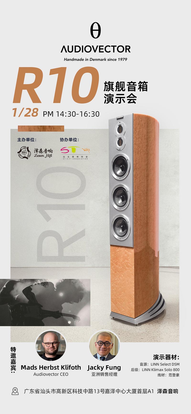 1月28日下午,泽森音响将在位于汕头嘉泽中心大厦首层的演示厅,带来极具开放(open)、平衡(balance)、有趣(fun)与如临现场(live like)的丹麦Audiovector傲力R10 Areteé 旗舰音箱演示会。