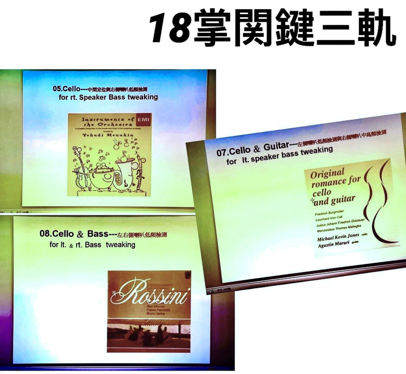 我先以十八掌检视后,再逐一解释左右、相位、极性,并让大家个别聆听,发现音场偏底,置中偏左,低音弦断掉没下沈。接着示范矫正并解说,完成摆位后同样个别聆听置中、高度、低音弦的音像与下沈。相信这是很多人第一次的经验。