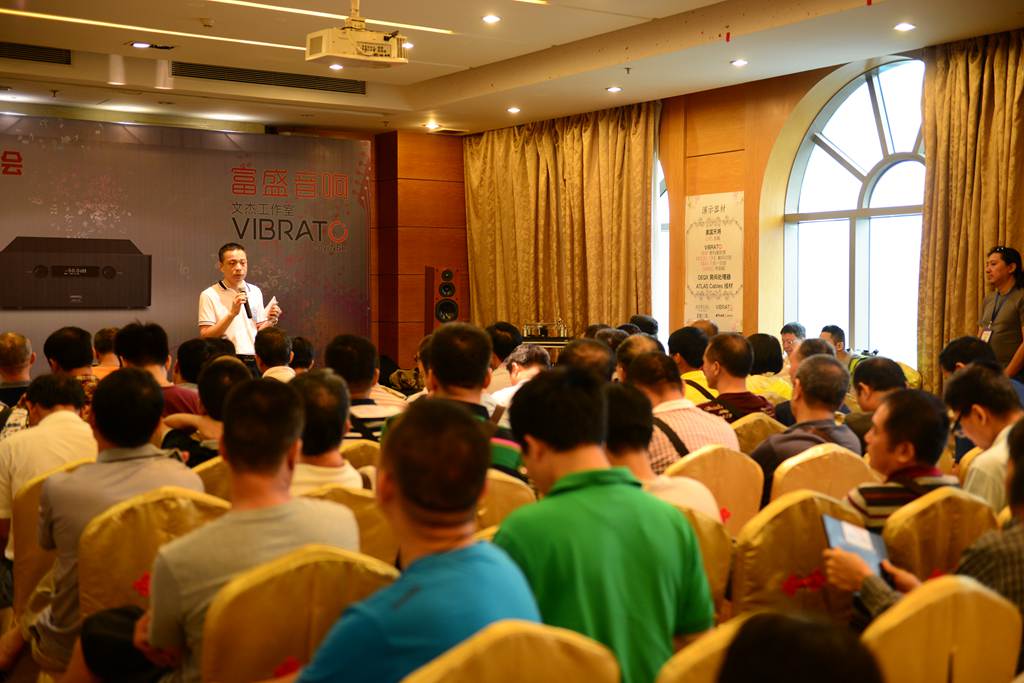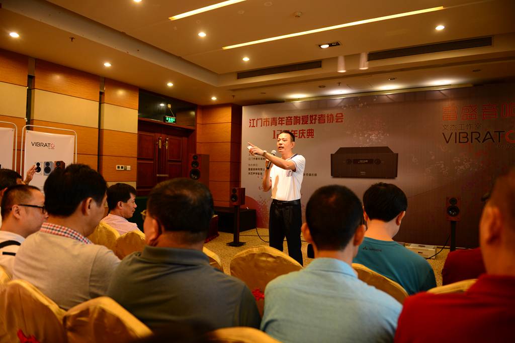 2016年7月3日,上午9:30--下午17:30在江门市名冠金凯悦大酒店2-3楼(广东省江门市蓬江区发展大道188号)举行12周年庆典活动。江门市青年音响爱好者协会12周年庆典活动现场犹如一个音响音乐鉴赏的嘉年华盛会,设置了多个小厅供来自全国各地的上海,厦门,广州,深圳,佛山,珠海,中山,阳江,肇庆,云浮,新兴等珠三角地区的音响音乐爱好者,来自广西钦州市灵山县音响协会的音乐爱好者,广西柳州市音响协会的音响爱好者,南宁市音响协会的音乐爱好者等等700多名发烧友尽情交流和鉴赏各种音响及黑胶唱片。众烧友远道而来聚在一起,真是难得一聚,12周年欣赏活动乃人气最旺的一次,七百多烧友分别在各个厅场观赏,坐位空无一缺。富盛音响大厅人满为患,热气腾腾,甚是热闹。乐友聚集一起,互相交流,进一步提高整体鉴赏水平。音乐制作讲解录音之迷,分享音响的经验,品味音乐的真蒂,使在坐的受益非浅。音响技师讲解器材并时时播放音乐软件,让大家领略到影音科技的进步,感受高雅音乐的熏陶。发烧友互动交流,气氛热烈,使得协会的12周年活动搞得有声有色,而意义深远。