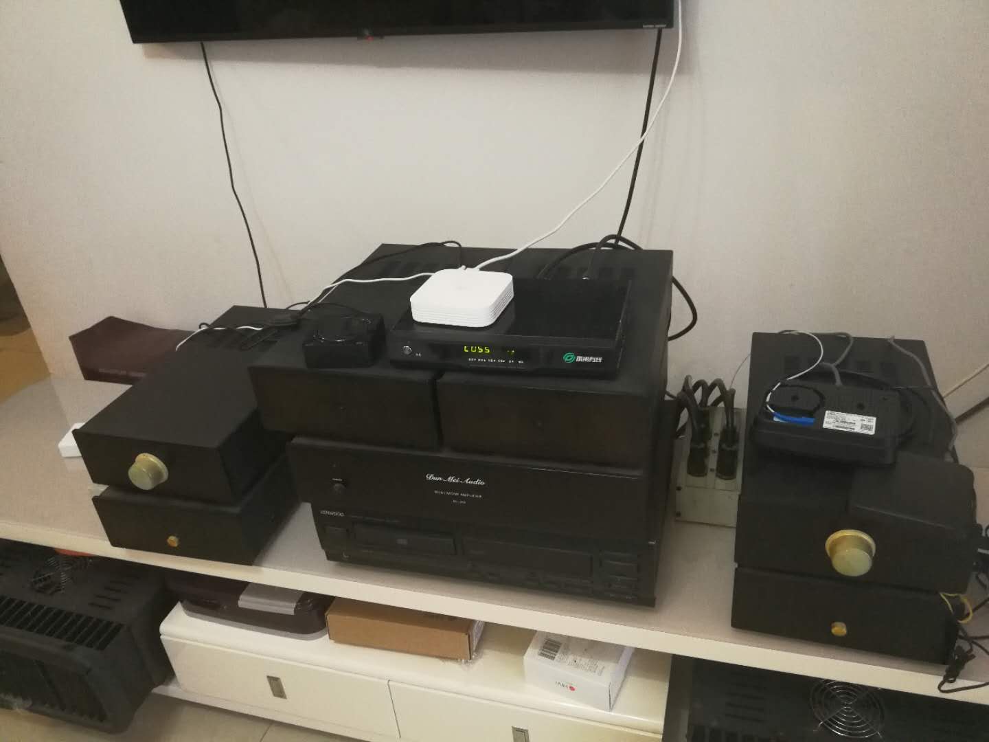 对于一个年轻人来说,没有家里的资助,不容易。机器是土炮,据说是参照CELLO磨的。分左右电源,下面转盘和CD解码。音响貌似是放珍妮西斯,用了铝带高音。总体布局,两前两后,奢侈吧?出来声音也可以。
