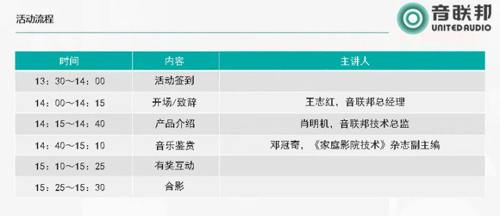 品鉴会现场,音联邦总经理王志红、音联邦技术总监肖明机以及《家庭影院技术》杂志副主编邓冠奇将为来宾进行产品系列的推荐以及音乐鉴赏活动。之后的有奖互动环节中,回答正确的参会者,将有机会获得现金券。同时,所有参会者都将获得由音联邦送出的精美伴手礼一份。