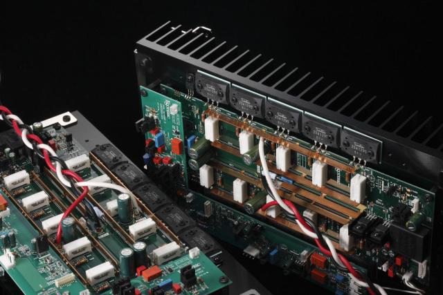 与C-03Xs前级属同一系列的S-03后级放大器,额定输出为145W×2声道(8Ω)、290W×2声道(4Ω)、最大输出功率甚至达580W×2声道(2Ω)。同样采用Grandioso的后级核心技术,有独立电源以及以4个独立单元组成“2×2双单声道”的双声道和驱动方式,电源部分采用了由尺寸、材料及安装方式均经过特别设计,特别订制的940VA大容量变压器,牢固地安装到5mm的系统底部,电容则采用了4.700μF×3平行双单声道配置方式,厂商更尽力降低放大器的输出阻抗及增加驱动能力,电路设计亦追求简单直接以及宽频域,采用双极LAPT的功率晶体管,连续操作时电流达17A,瞬间电流更高达34A,而阻尼因数更达至1000水平等等。