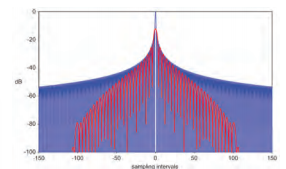 图5强调了一个重要的点:sinc(x)函数的包络 — 对于x值从负无穷大到正无穷大的有限值 — 随时间缓慢衰减。在距其中心峰值150个采样间隔处,包络仅衰减了50dB多一点。显而易见的问题是:它必须衰减多少才能使其对样本间波形的贡献变得微不足道?